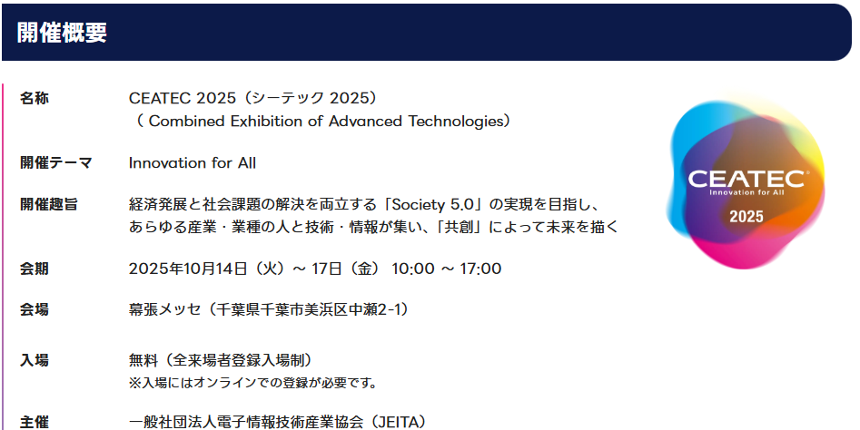 国内最大級のデジタル技術の見本市、がCEATEC。昨年も見に行ったが、共通テーマがなく、様々な会社、業種の会社が様々な自社製品、サービスを紹介する場、なので統一感がなく目的を持っていくものではない。出会いを楽しむ、くらいの気持ちでいくのがよさそう。金曜日は学生さんも大勢来場。4日間の来場者数は10万人弱。