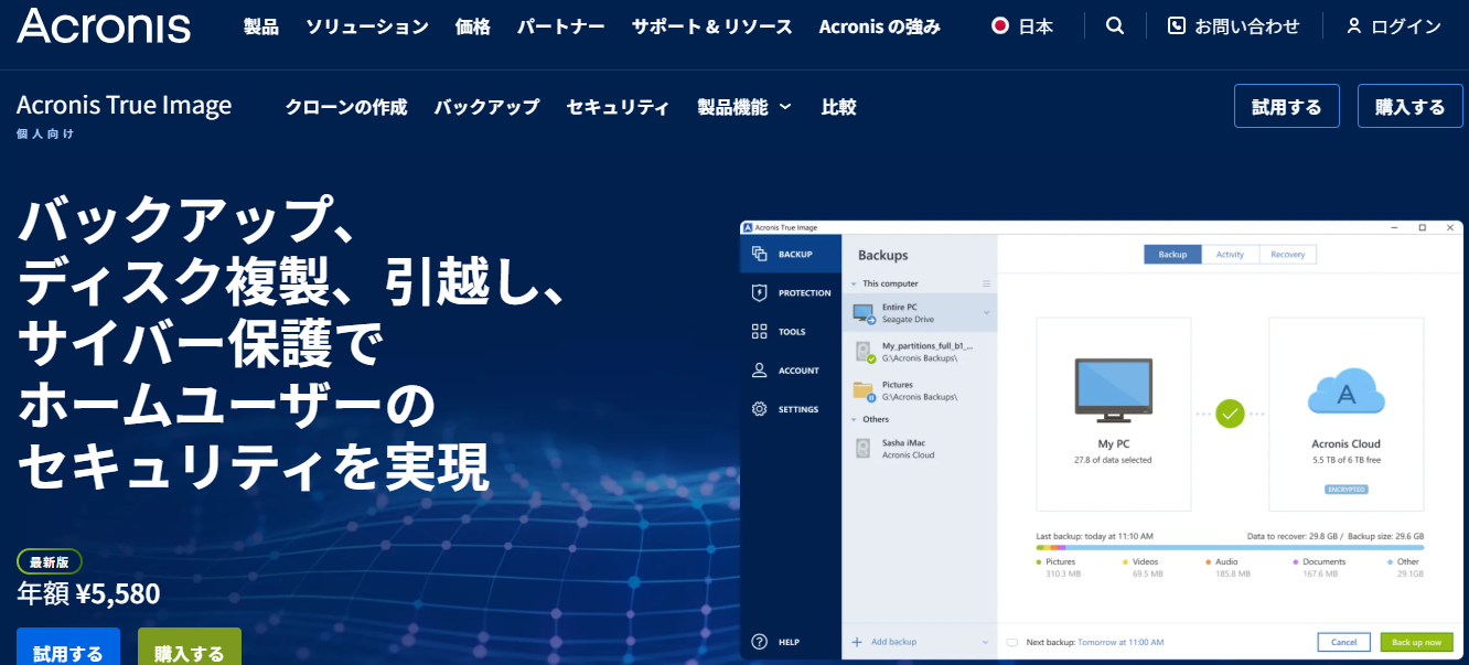 これにOSを含めてCloneするためのツールがあります。Acronsという会社のTrue Imageという3rd Partyのソフト。このソフト、CRUCIALのSSDがシステムデバイスとしてインストールされていないと起動できません。つまりType-Cで外部接続したCRUCIALのSSDではダメ、という事。
